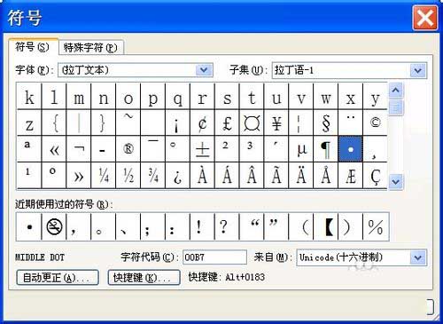 2、在打开的符号对话框中 找到符号选项卡,字体找到“拉丁文本”,拖动右边的下拉滚动条,仔细找到点号,如下图;