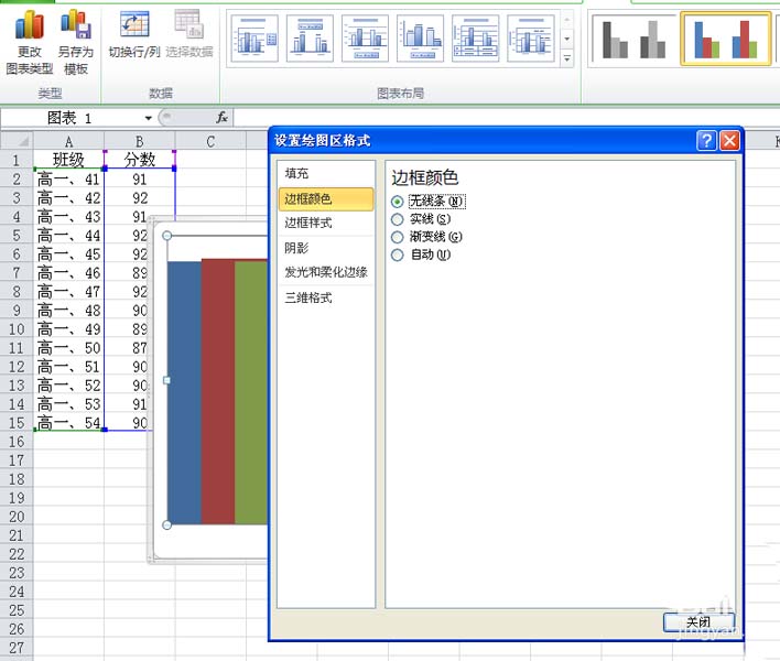 7、选择图表,在设置绘图区格式中设置边框颜色为无线条,设置完成后查看效果。
