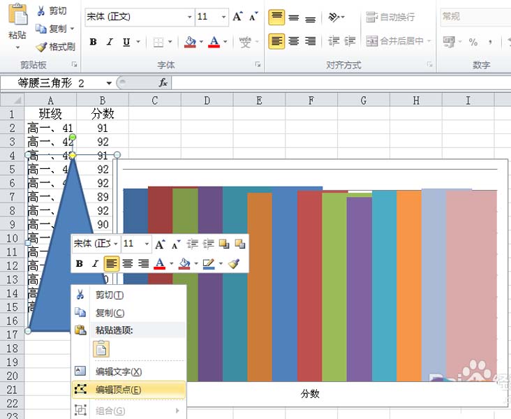 8、执行插入-形状-等腰三角形命令,在excel中绘制一个三角形,右键单击该三角形,从下拉菜单中选择编辑顶点选项。