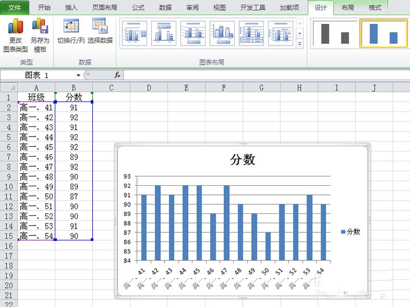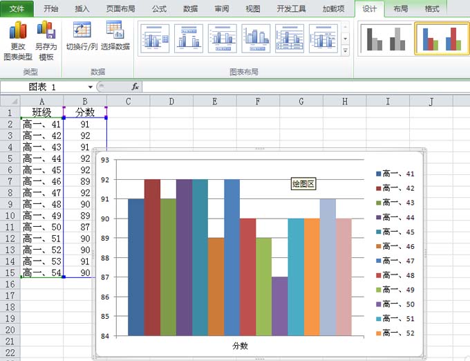3、选择图表,在设计选项下点击切换行列按钮,接着每一个数据就变成了一个系列。