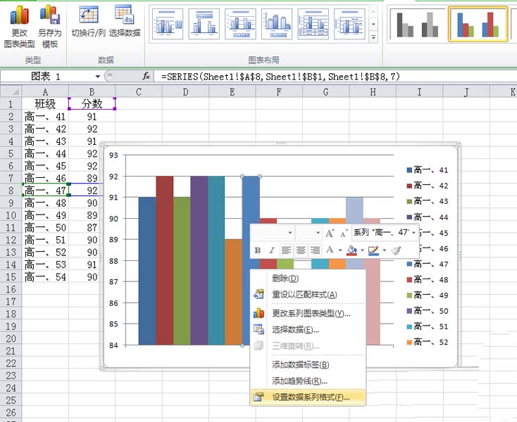 4、选择其中一个柱子,右键单击从下拉菜单中选择设置数据系列格式选项,接着弹出设置系列格式对话框。