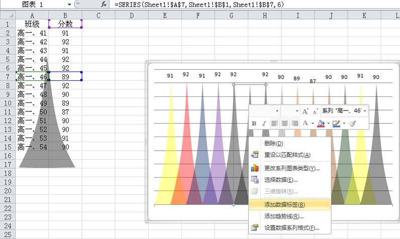 12、右键单击每一个系列从下拉菜单中选择设置数据标签,这样交叉图表就制作完成了,执行文件保存即可。