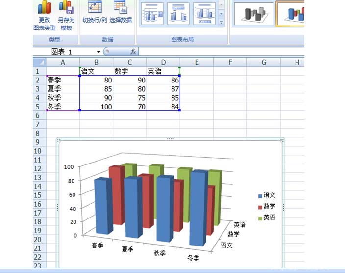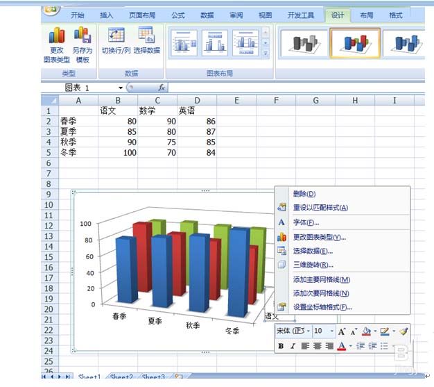 6、此外,单机坐标轴上的文本后,还可以通过点击—编辑数据选项。对图标上的数据进行编辑。最终,一张三维柱状图就完成了,从这张图,我们可以看出许多信息:比如:春季的时候,小明成绩最好的数学。一年下来,小明的英语成绩不变。