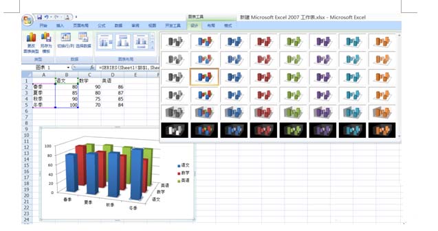 4、点击柱状图上的彩色柱块,然后点击设计,会弹出许多模板,利用他们可以调节柱条的颜色搭配。