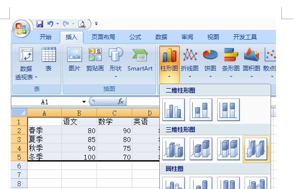 2、点击菜单上--插入—柱状图,这里有个三维柱状图的选项,点击最后一个。