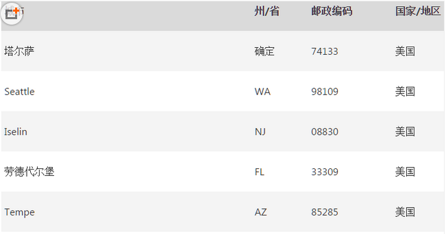 结果:Tulsa,OK,74133,US;Seattle,WA,98109,US;Iselin,NJ,08830,US;Fort Lauderdale,FL,33309,US;Tempe,AZ,85285,US