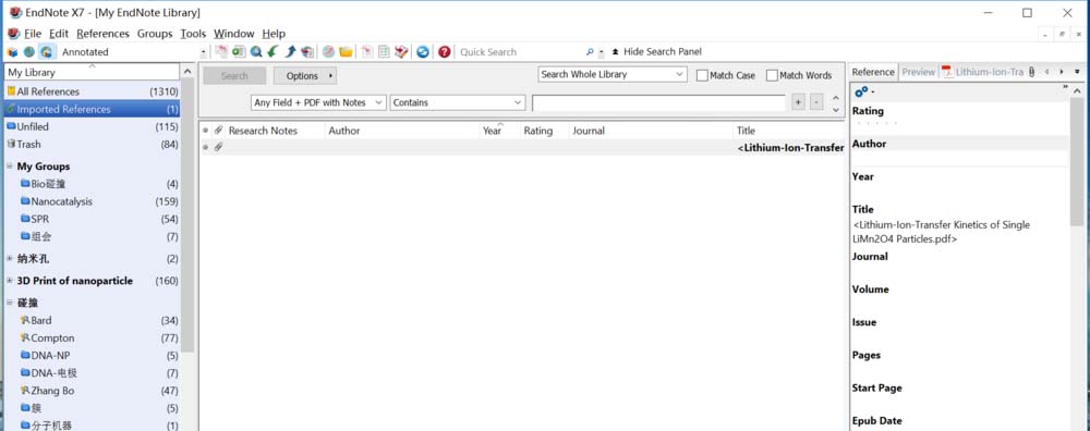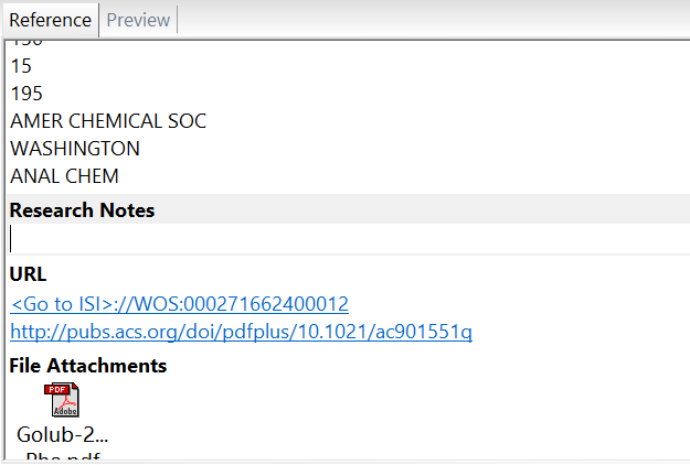 7、如果想重新编辑文献的笔记,就重新在Endnote软件Reference/Preview面板的Reference界面找到 Research Note条目,单击即可修改文献笔记
