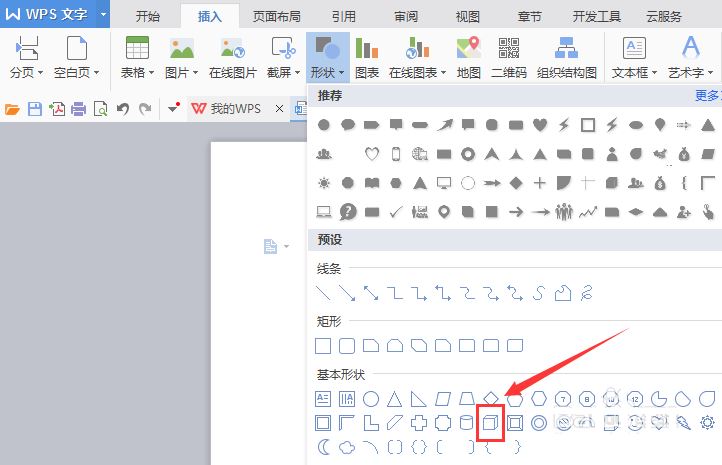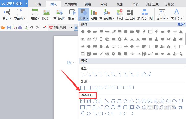 4、点击形状选项,在其子级菜单里找到基本形状选,如图所示: