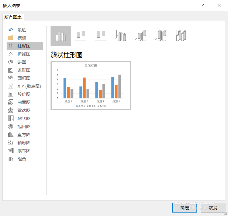 2、在“菜单栏”中找到“插入”,在插入的图表区域选择“图表”,即可在弹出的对话框中选择我们想要的数据类型,这次我们选择的是默认(柱状图)