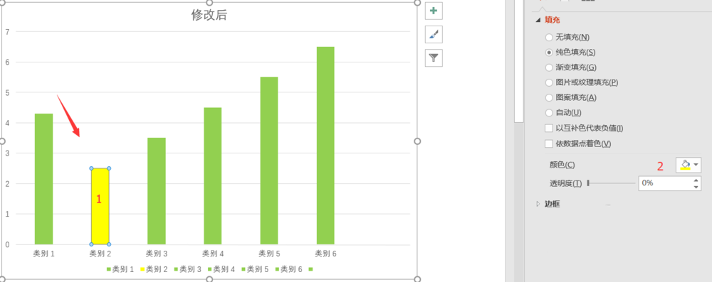 6、修改单一柱形图颜色,在选择图表的基础上,再次单击我们想要更改颜色的柱形图,选中它,最后修改颜色即可。