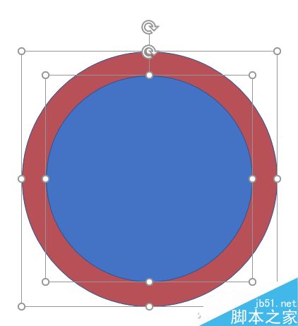 启动PowerPoint 2016后,新建一个空白的演示文稿,然后切换到“插入”选项卡中,点击“形状”,选择绘制一大一小两个圆形(绘制时按住Shift键不放即可得到正圆形),并将它们的圆心对齐,然后全选这两个圆。