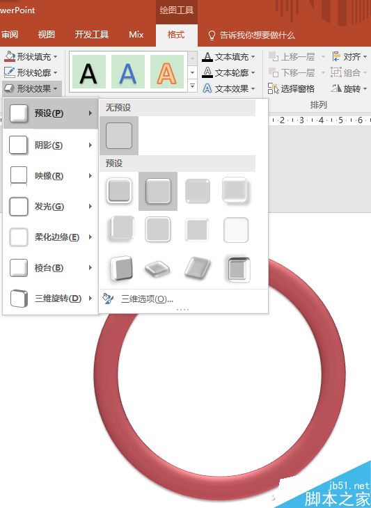 切换到“绘图工具-格式”,然后点击工具栏上的“合并形状”,选择“组合”模式,即可得到一个圆环形了。将这个圆环复制出一份,并设置为灰色填充,然后放到一边待用。接下来继续选中圆环,点击“形状效果”,从下拉菜单中选择一种立体样式,将圆环变成立体。