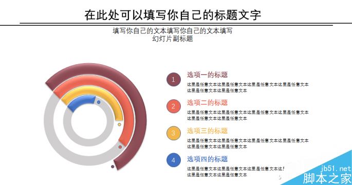 好了。通过同样的方法,再制作出其他几个半环图,然后将它们分别填充上不同的颜色,并叠加到一起。最后再添加相应的文字内容和装饰,一个酷炫的幻灯片就制作完成啦,效果还不错吧。