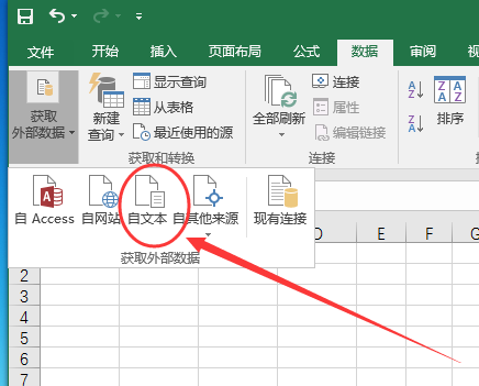 1、打开Excel2016,找到菜单栏中的“数据”,点击“数据”下方工具栏中“获取外部数据”的倒三角号,找到“自文本”图标,并点击;