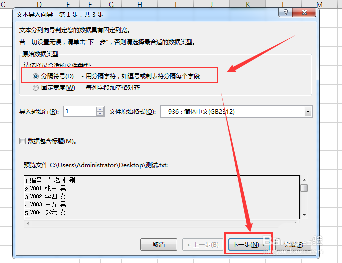 3、进入文本导入向导,选择文件类型,一般选择分隔符号,当然也可以根据自己文本的方式来选择是分割符号还是固定宽度,然后点击“下一步”;