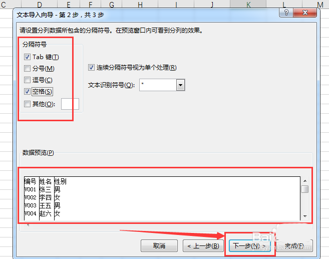 4、选择分割符号类型,Tab键、分号、逗号、空格或是其他,在数据预览处可以看到数据效果,设置完毕后点击“下一步”;
