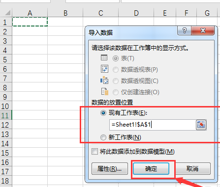 6、在弹出的导入数据框,设置数据的放置位置,可以在现有工作表或者新工作表,之后点击“确定”,即可在Excel中看到导入效果。