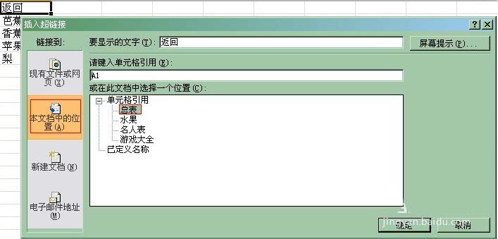 3、总表我们都写了分类名称,那么我们在各分类名称表中也要写上数据,如:水果表-苹果、梨、香蕉等等;然后我们在总表的水果品种点击右键选择超链接;链接到:选择本文档中的位置,然后在文档中选择一个位置,水果当然对应水果品种,点击确定即可;