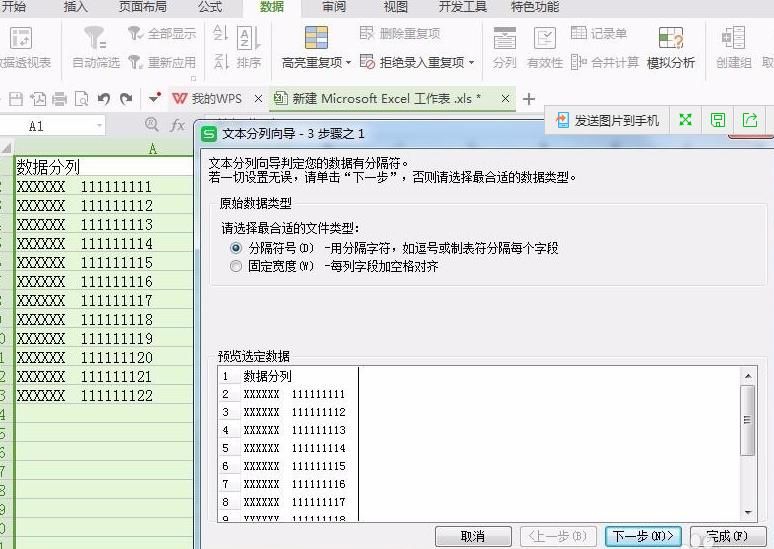 5、选择文件类型,然后进入下一步后,切换到步骤2,根据需要,设置分割符号,设置好后点击下一步,然后点击完成,如下图所示