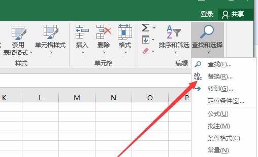 2、这时我们点击开始工具栏上的“查找和选择”下拉菜单,在弹出菜单中选择“替换”菜单项