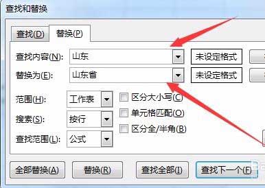3、在打开的查找和替换窗口中,我们在查找内容处输入山东,在替换为输入山东省