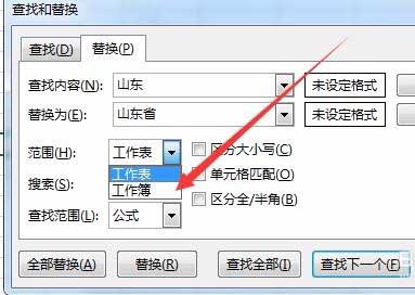 4、接下来我们点击“范围”下拉菜单,在下拉菜单中选择“工作簿”菜单项