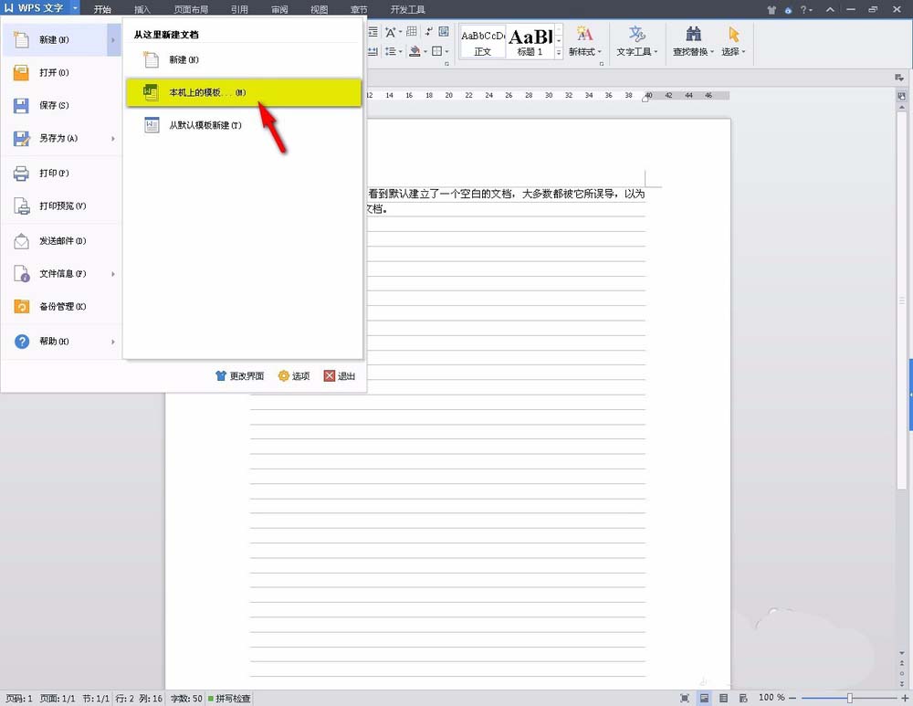 2、在打开的WPS软件中,单击左上角的WPS文字按钮,选择从“本机上的模板……”按钮,单击