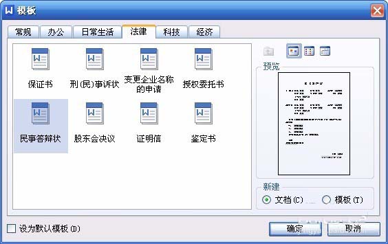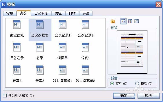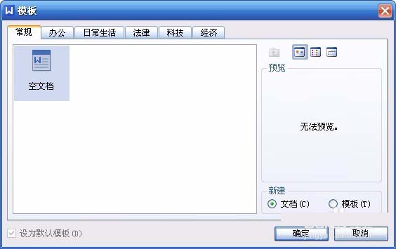 3、在弹出的窗口中,就会看到很多模板选项标签。有常规、办公、日常生活、法律、科技、经济。“常规”中的空文档就是我们双击“WPS文字处理”默认建立的文档版式,这里我们选择一下“办公”