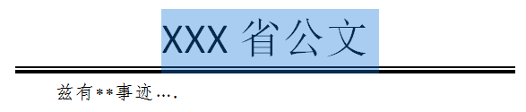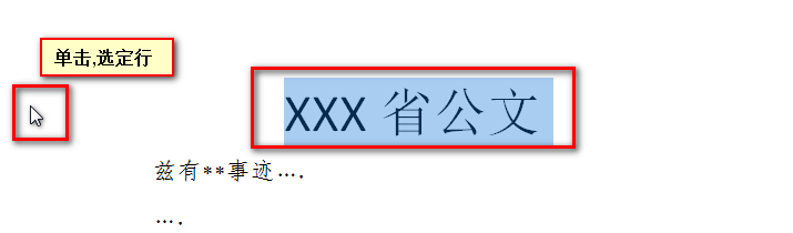 1、打开公文一份。单击公文标题左侧编辑区域外(鼠标由"I"变成箭头时单击),使标题处于选定状态