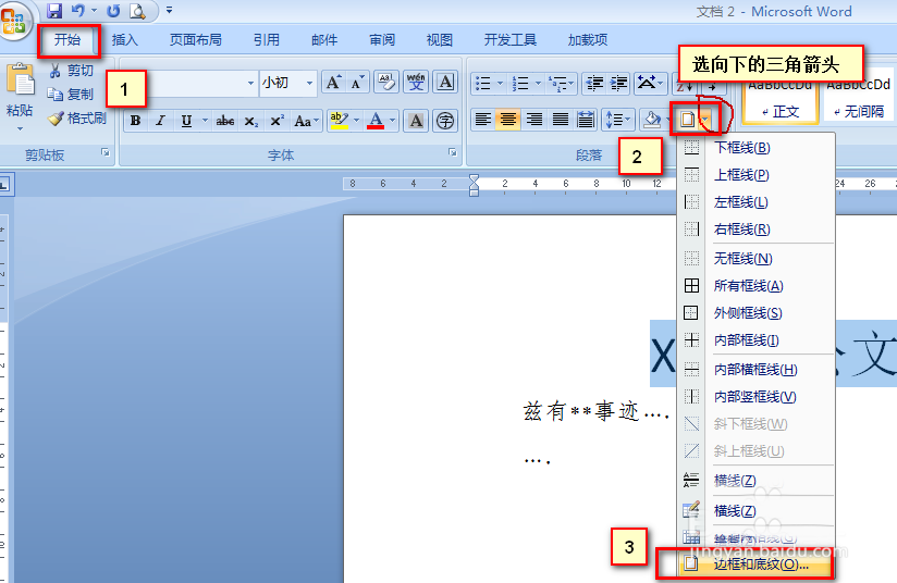 2、找到"开始"——"段落"——"边柜"图标(!小倒三角形!)——"边框和底纹"