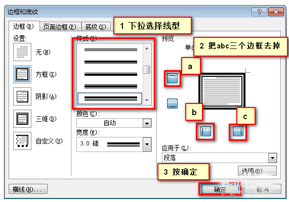 选择完后,不能马上按"确定"!!因为这时,你还没告诉WORD,你要改哪条边