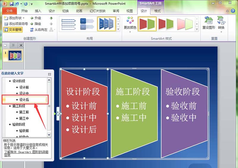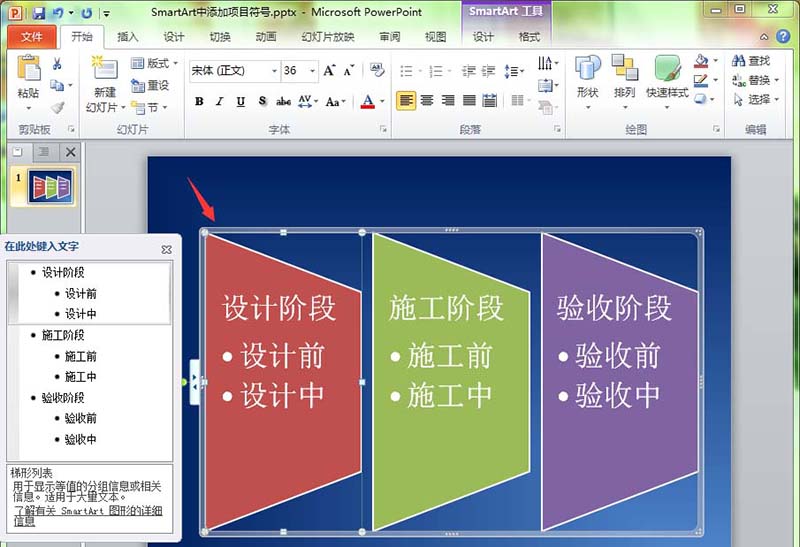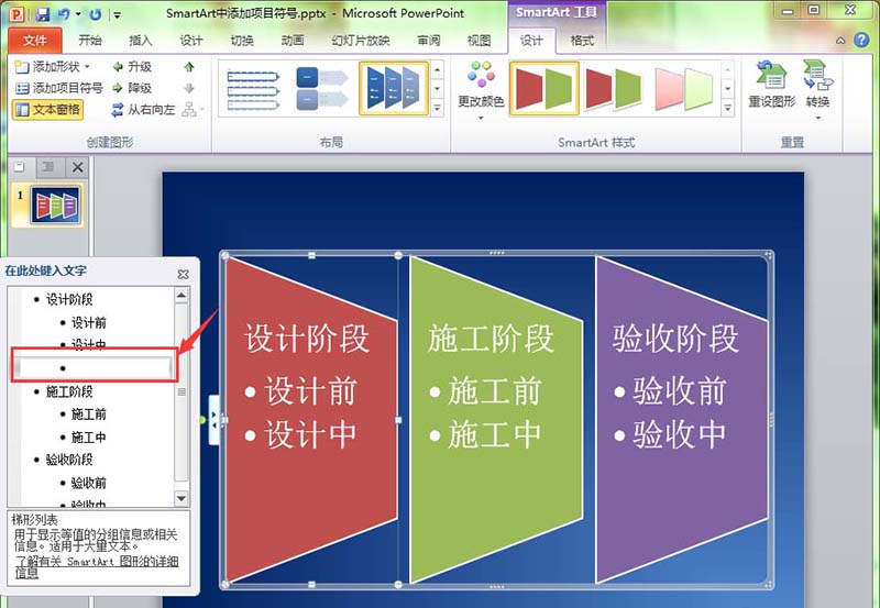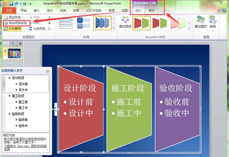 3、选择“SmartArt工具--设计”功能菜单,单击工具栏中的“添加项目符号”按钮。