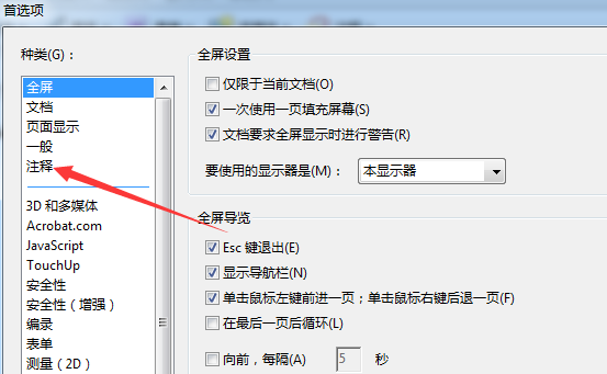 4、选中首选项的窗口中,选中左侧中的注释的选项。