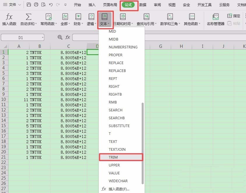 2、点击【公式】,之后点击【文本】下面的倒三角,出现列表,下拉列表,在列表中找到【TRIM】函数,点击。