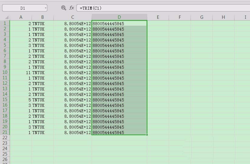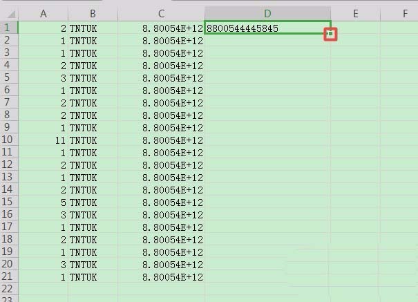 1、打开文件,可以看到C列的数字都是科学计数法表示的,点击【D1】。