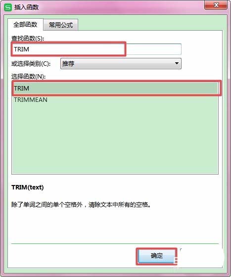4、弹出插入函数窗口,在【查找函数】里输入要查找的函数,之后选择函数【TRIM】,点击【确定】。