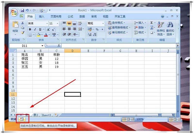 2、点击excel应用程序窗口状态栏中左侧的“宏录制”按钮。