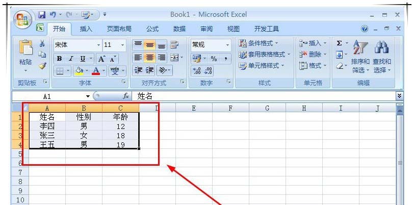 4、接着按下CTRL+SHIFT键,再分别先后按下方向右键、方向下键,选中表1中全部数据。