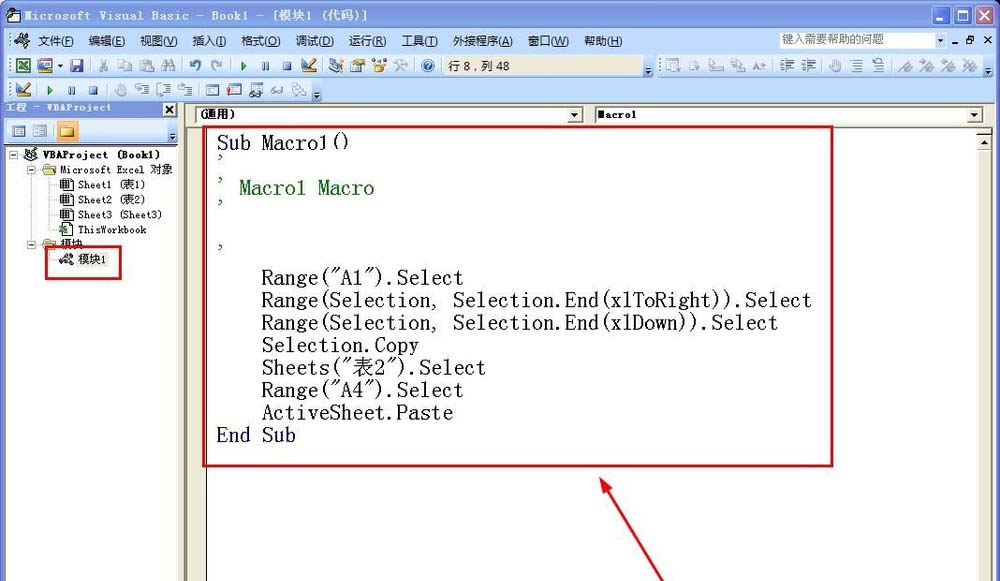 7、按下组全键:ALT+F11,打开vba编辑窗口,展开模块,双击打开模块1,在右侧就可以看到刚录制的宏代码了,这个代码基本就能解决前面提出的问题了。