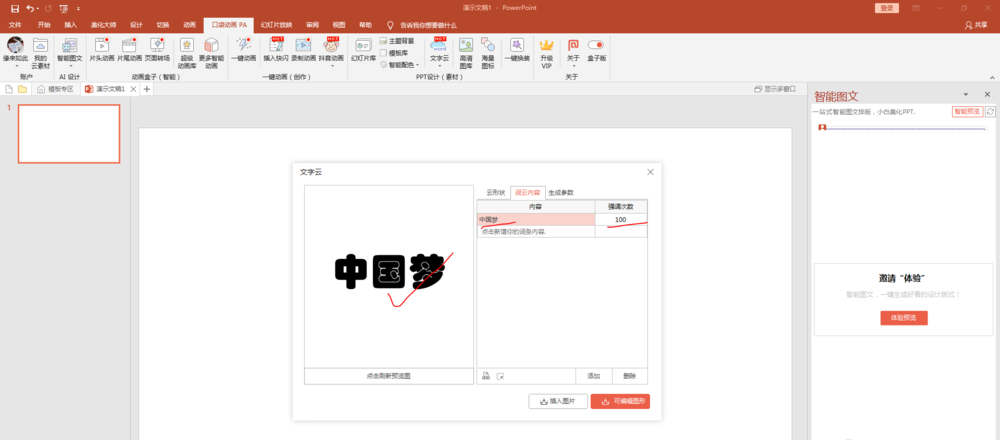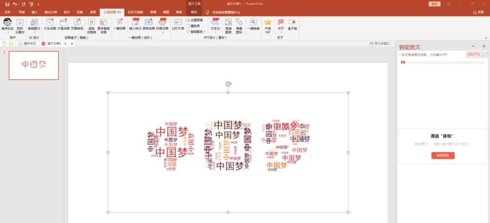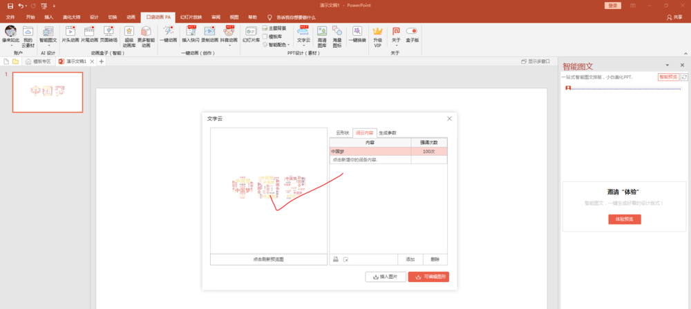 3、安装完毕后,打开PPT,可以发现窗口显示“口袋动画”选项卡,选项卡中包括“文字云”命令。