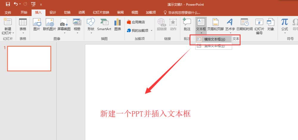 1、新建一个PPT演示文稿,在插入菜单中选择横排文本框,然后在幻灯片页上插入一个横排的文本框,并在文本框中输入文本内容。