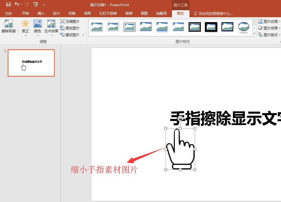 3、在插入菜单中找到图片,单击图片,将我们之前找到的一个手指的素材图片选中导入到幻灯片页上,选中插入的图片,将其缩小到合适的大小并放在合适的位置上。