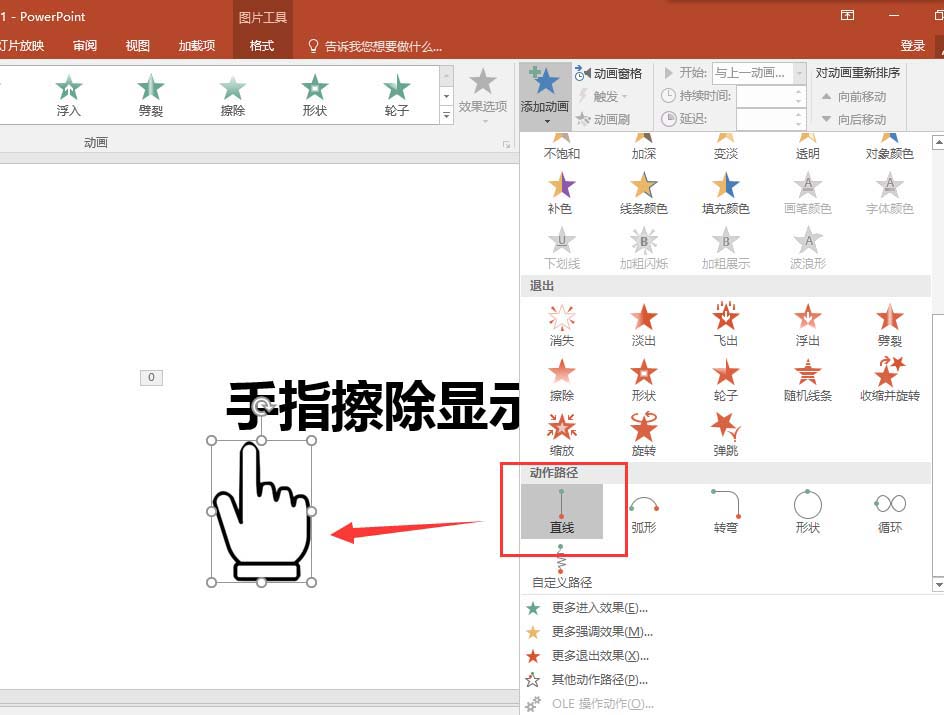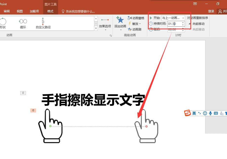 5、接着上一步的擦除动画,设置擦除动画开始为与上一动画同步,持续时间为1.5秒;然后在选中手指素材图片,为其添加一个直线的动画效果。