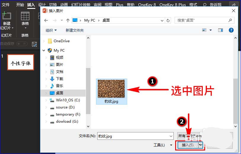 3、字体调整好后,我们就该给文字穿上衣服啦!点击“插入”菜单,在其子菜单中选择“图片”选项,然后在弹出的“插入图片”对话窗口中选中需要插入的图片,点击“插入”按钮,这样图片就插入到PPT中啦!如图所示: