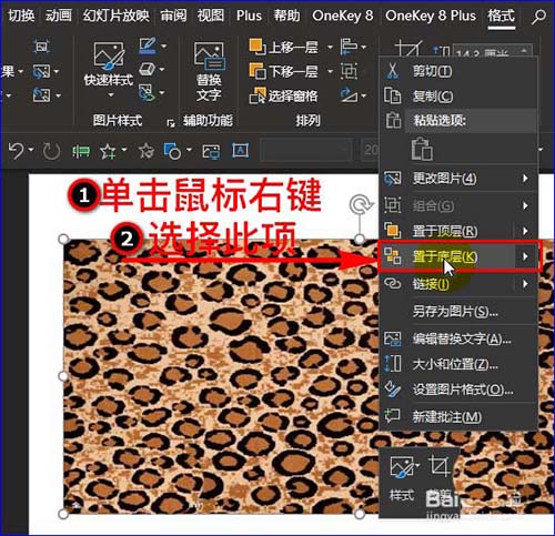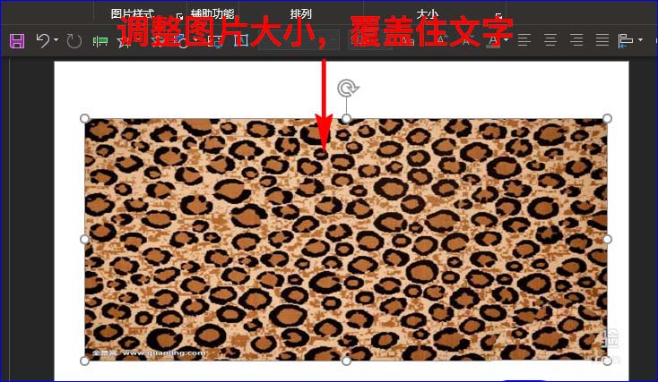 4、调整图片的大小,使其能覆盖住文字。然后选中图片,单击鼠标右键,在扩展框中选择“置于底层”选项,这样图片就在文字下面。如图所示: