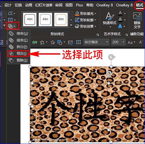 6、图片和文字选中后,我们点击格式菜单,在其子项中点击“合并形状”选项,然后在其字项中点击“相交”,这时就会发现PPT中的文字穿上衣服啦!如图所示:
