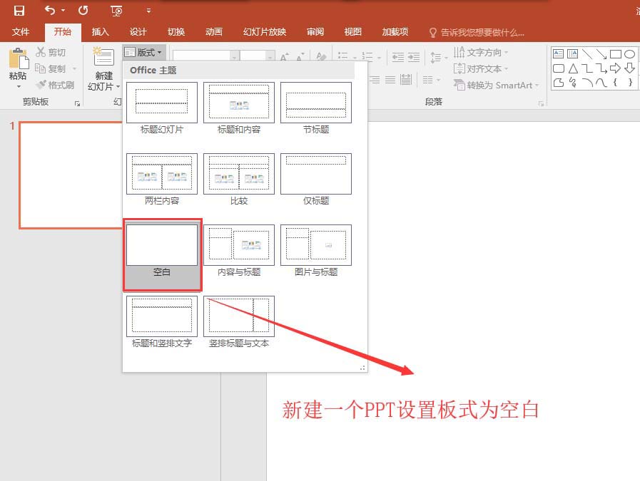 1、新建一个PPT演示文稿,在新建的空白的PPT演示文稿中,找到开始菜单中的板式命令,在PPT板式中选择一个空白的板式效果。