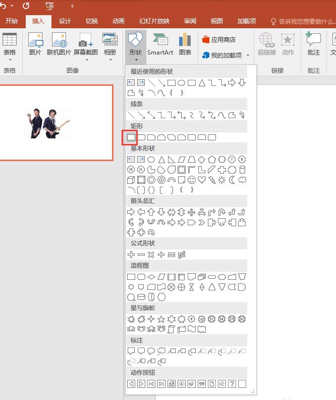 3、还是在插入菜单中,找到形状选项,点开形状,在形状中用鼠标左键单击矩形形状,选中矩形形状。
