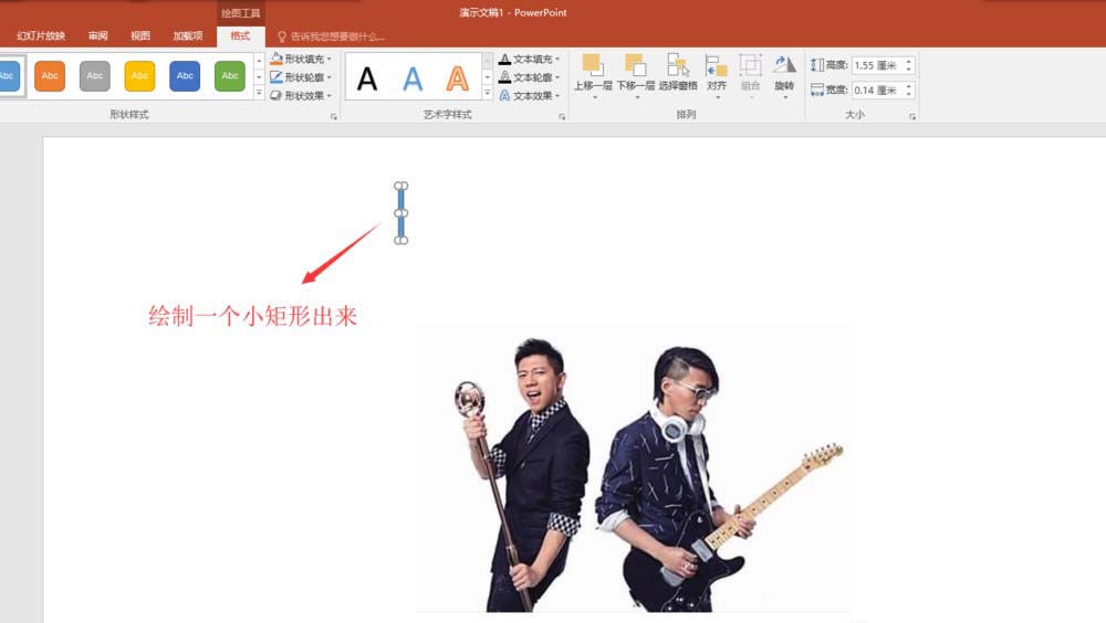 4、选中矩形形状之后,在PPT的幻灯片上拖动鼠标左键插入一个矩形出来,这里的矩形只要是一个矩形条就可以了。