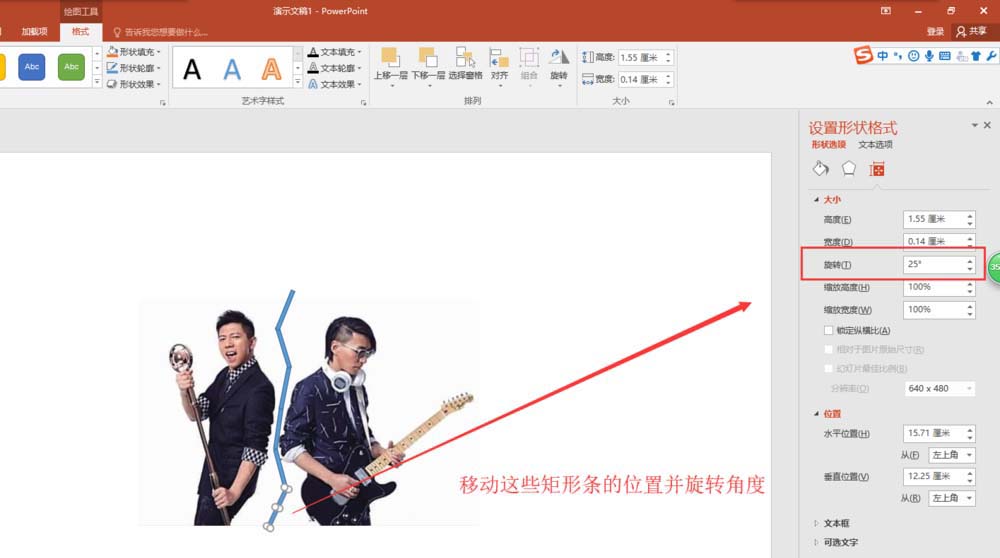 6、依次选中复制出来的矩形条,将其移动位置,并在设置形状格式窗口中设置旋转的角度,将这些矩形条以不同的旋转角度拼接在一起并摆放在要将图片分开的地方。